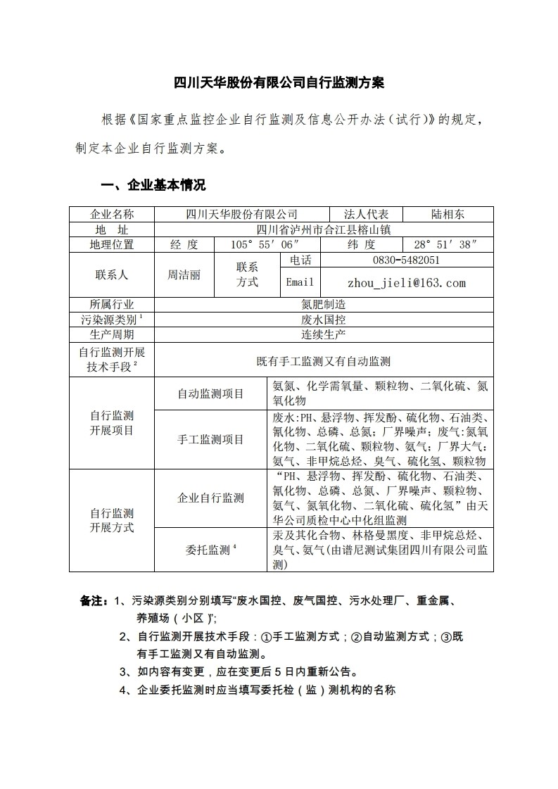 四川天華股份有限公司2018年自行監(jiān)測(cè)方案