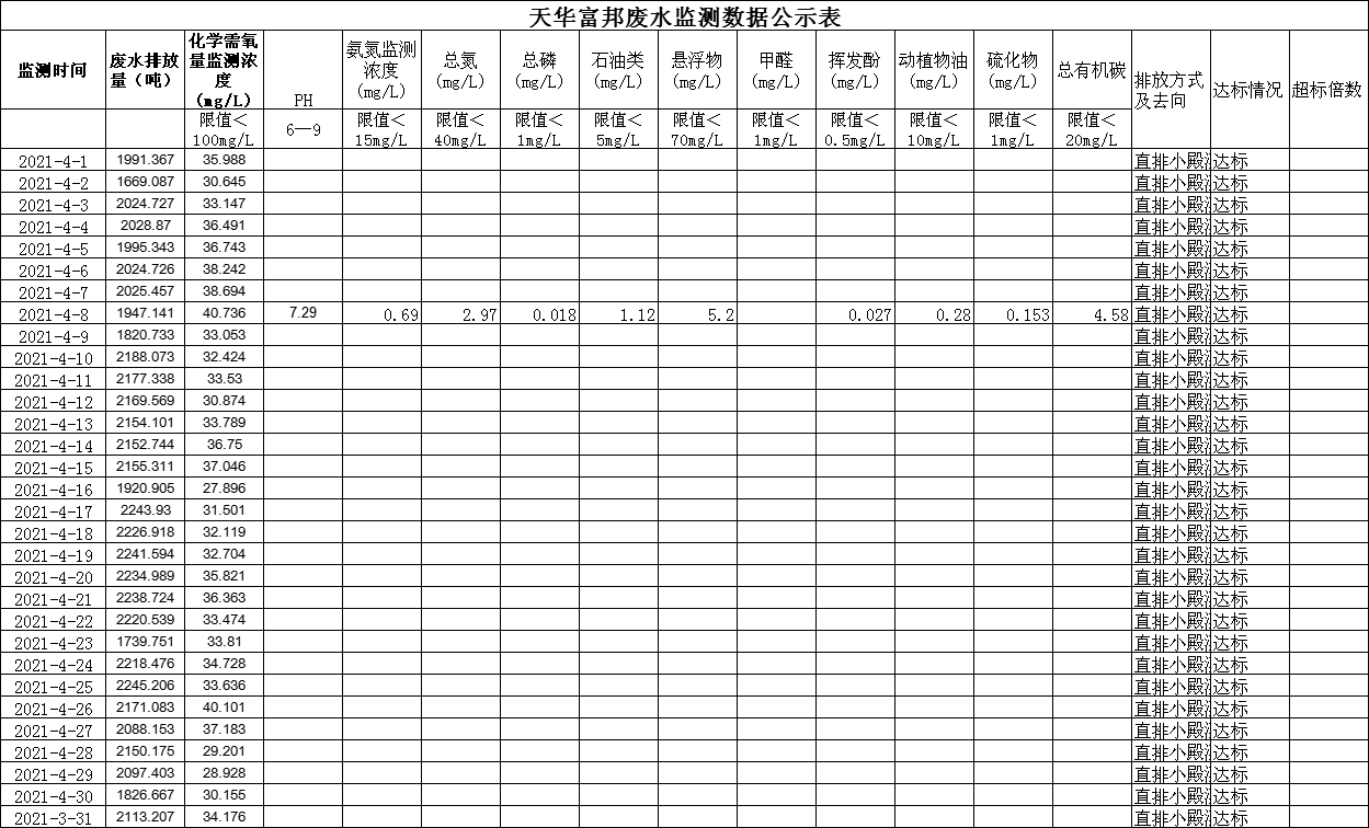 四川天華富邦化工有限責任公司4月廢水監測數據公示