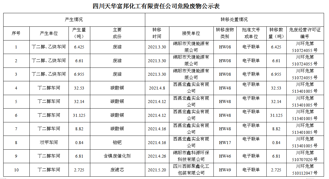 四川天華富邦化工有限責任公司危廢轉移情況公示