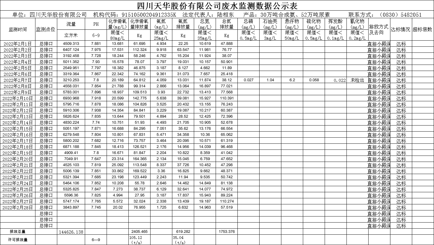 四川天華股份有限公司2022年2月廢水監(jiān)測數(shù)據(jù)公示