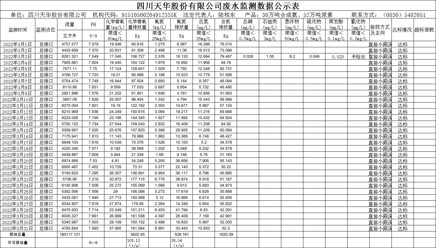 四川天華富邦化工有限責任公司2022年3月廢水監測數據公示