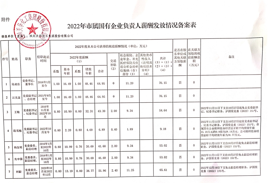 2022年市屬國有企業負責人薪酬發放情況備案表
