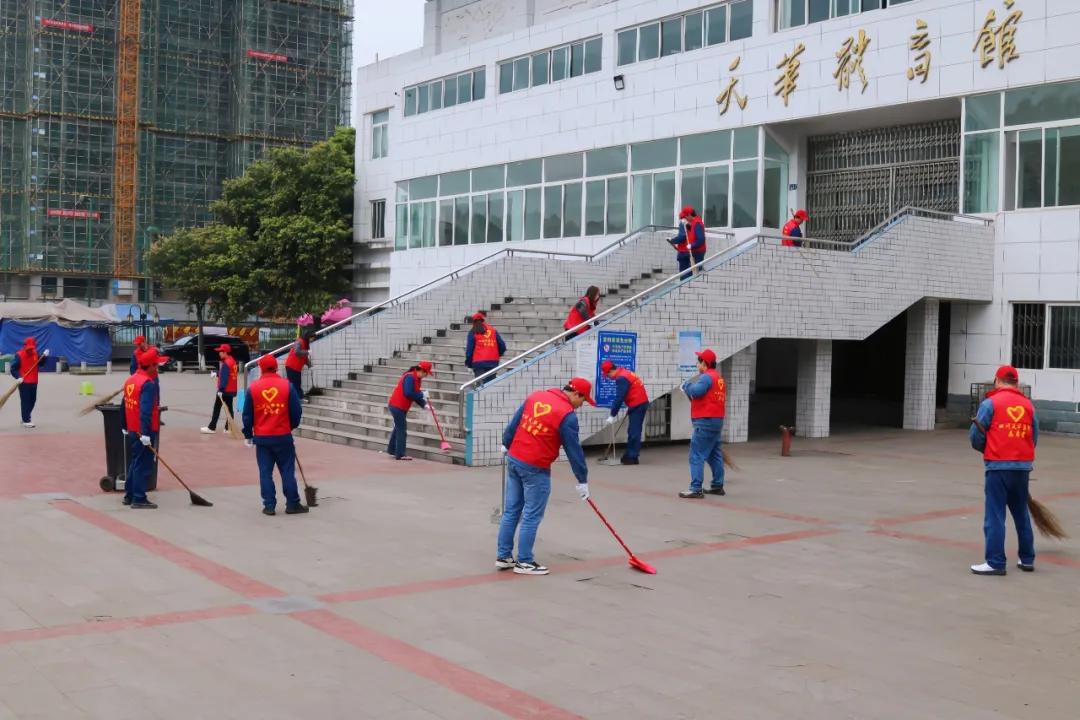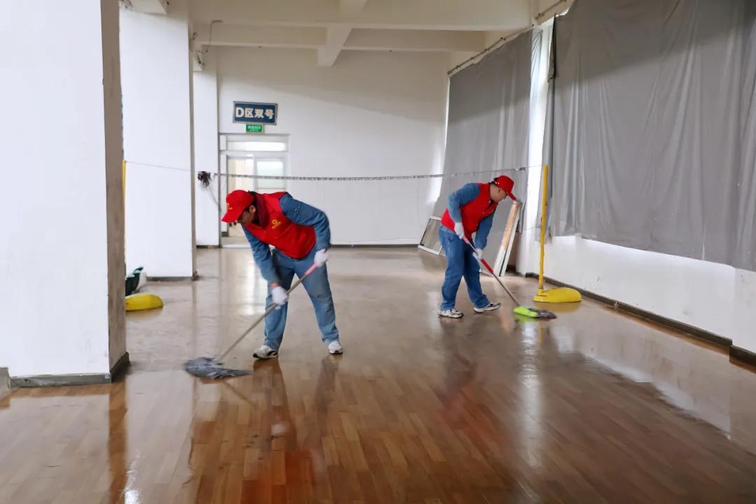 活動(dòng)現(xiàn)場,志愿者們身著統(tǒng)一服裝、佩戴手套,手持清掃工具在體育館大門集合就緒,隨后分工協(xié)作、迅速行動(dòng),全力投入到體育館內(nèi)部及周邊公共區(qū)域的清掃工作中。